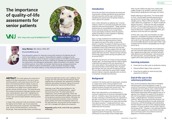 Veterinary nurses( VNs) are key facilitators in the assessment process, providing education, support and continuity of care. The article advocates for collaborative, client-centred approaches, where VNs support owners with assessments, address concerns and ensure decisions prioritise animal welfare. Ultimately, the use of QoL assessments empowers owners, enhances patient welfare and fosters trust between clients and the veterinary team, ensuring that the final chapter of a pet ' s life is managed with dignity and compassion.
