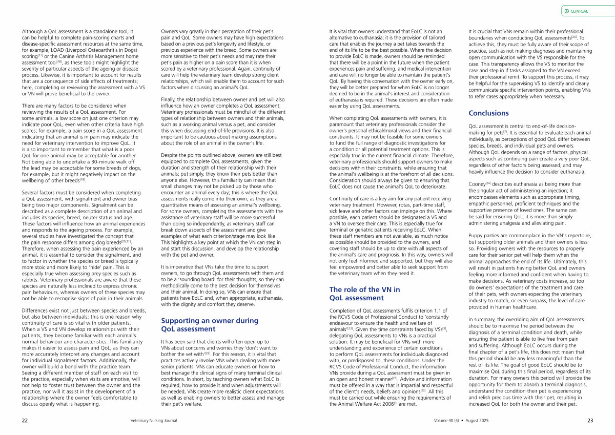 When completing QoL assessments with owners, it is paramount that veterinary professionals consider the owner ' s personal ethical / moral views and their financial constraints. It may not be feasible for some owners to fund the full range of diagnostic investigations for a condition or all potential treatment options. This is especially true in the current financial climate. Therefore, veterinary professionals should support owners to make decisions within their constraints, while ensuring that the animal ' s wellbeing is at the forefront of all decisions. Consideration should always be given to ensuring that EoLC does not cause the animal ' s QoL to deteriorate.