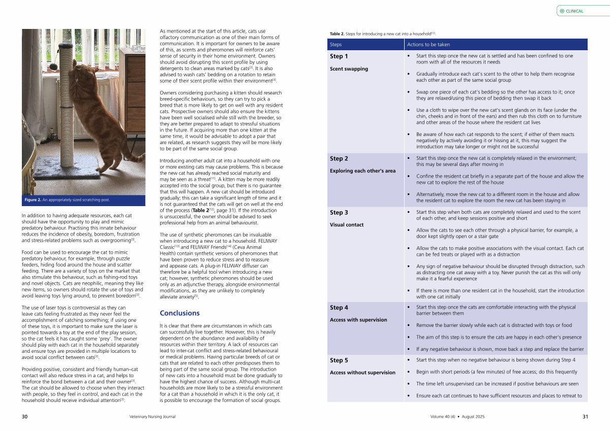 Introducing another adult cat into a household with one or more existing cats may cause problems. This is because the new cat has already reached social maturity and may be seen as a threat [ 11 ]. A kitten may be more readily accepted into the social group, but there is no guarantee that this will happen. A new cat should be introduced gradually; this can take a significant length of time and it is not guaranteed that the cats will get on well at the end of the process( Table 2 [ 12 ], page 31). If the introduction is unsuccessful, the owner should be advised to seek professional help from an animal behaviourist.