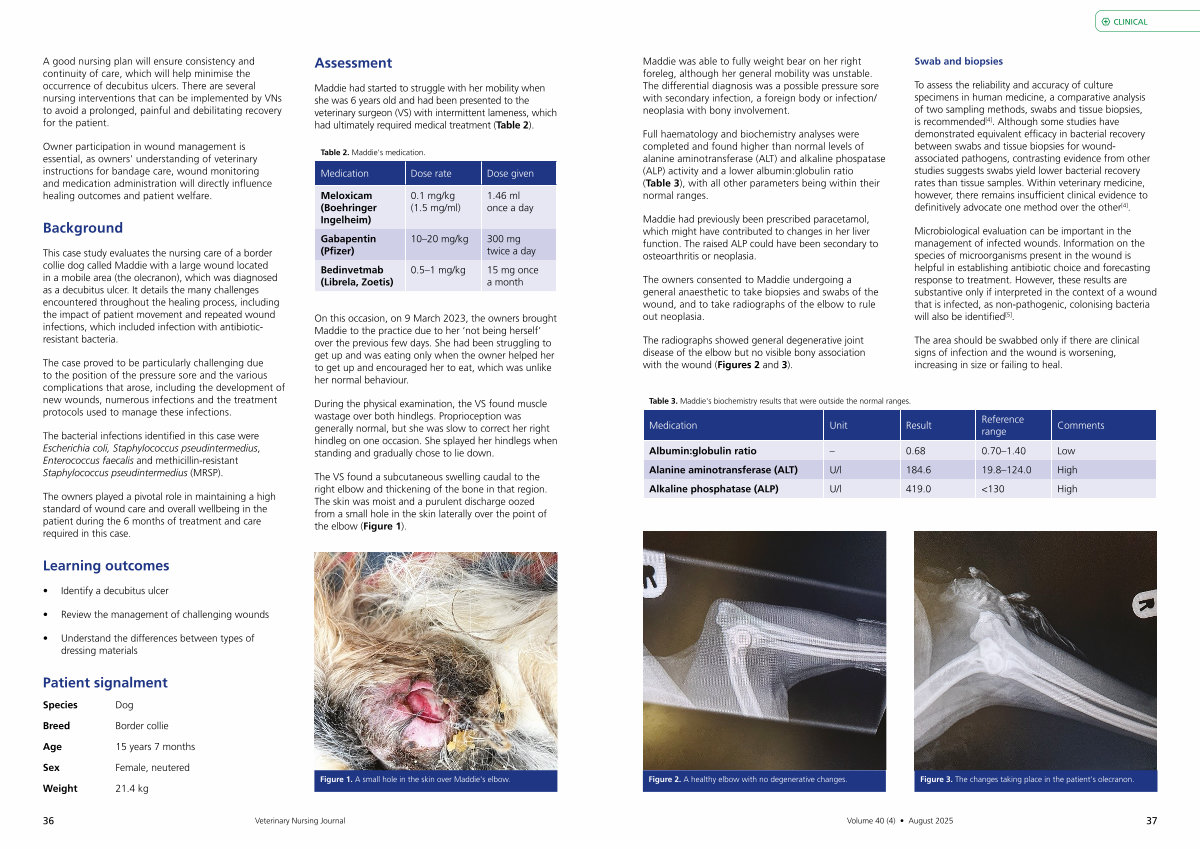 The owners consented to Maddie undergoing a general anaesthetic to take biopsies and swabs of the wound, and to take radiographs of the elbow to rule out neoplasia.