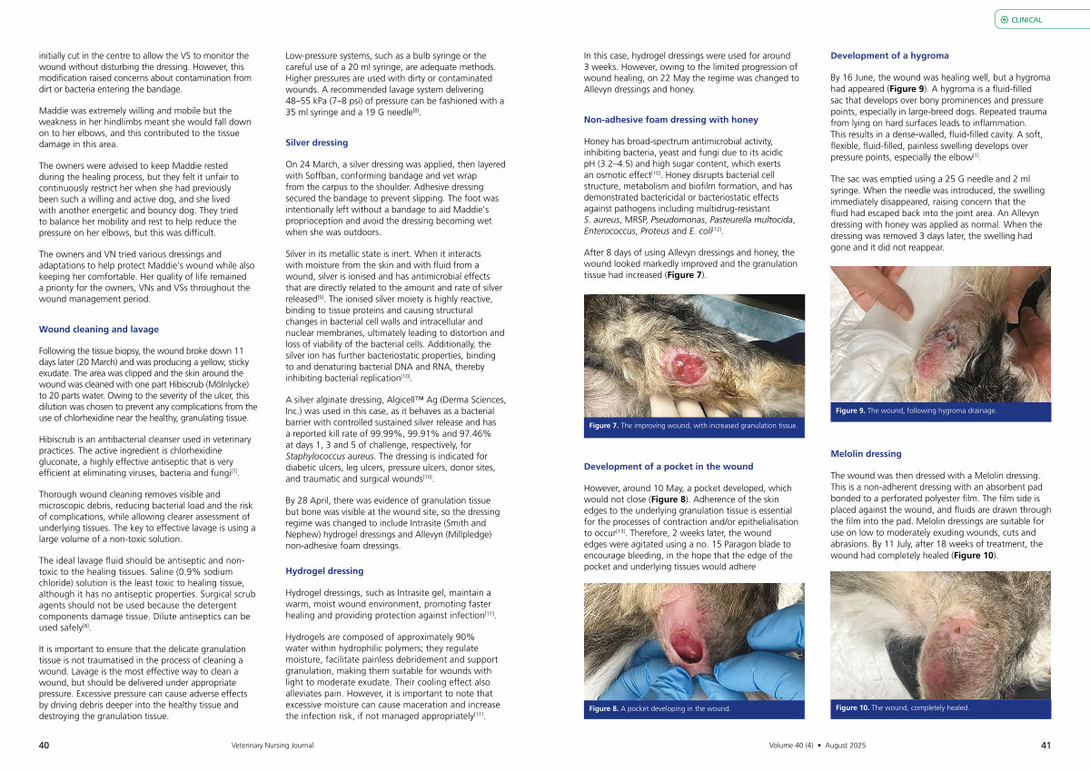 By 16 June, the wound was healing well, but a hygroma had appeared( Figure 9). A hygroma is a fluid-filled sac that develops over bony prominences and pressure points, especially in large-breed dogs. Repeated trauma from lying on hard surfaces leads to inflammation. This results in a dense-walled, fluid-filled cavity. A soft, flexible, fluid-filled, painless swelling develops over pressure points, especially the elbow [ 1 ].