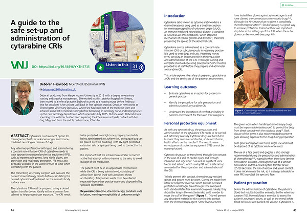 Any veterinary professional setting up and administering a constant-rate infusion( CRI) of cytarabine needs to wear appropriate personal protective equipment( PPE), such as impermeable gowns, long nitrile gloves, eye protection and respiratory protection. PPE must also be readily available in the ward for staff to wear when interacting with the patient.