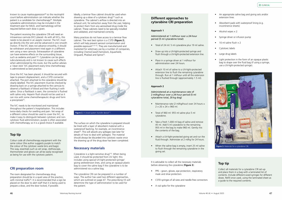 Collect all materials for a cytarabine CRI set-up and place them in a bag with a laminated list of contents. Include different-sized syringes for different doses. Refill once used, using the laminated sheet as a guide to the required contents.