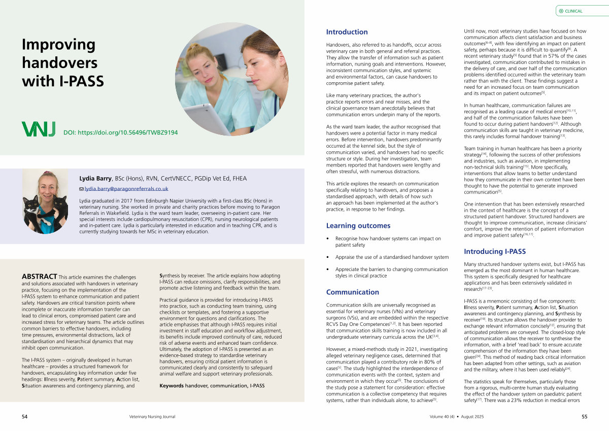 Practical guidance is provided for introducing I-PASS into practice, such as conducting team training, using checklists or templates, and fostering a supportive environment for questions and clarifications. The article emphasises that although I-PASS requires initial investment in staff education and workflow adjustment, its benefits include improved continuity of care, reduced risk of adverse events and enhanced team confidence. Ultimately, the adoption of I-PASS is presented as an evidence-based strategy to standardise veterinary handovers, ensuring critical patient information is communicated clearly and consistently to safeguard animal welfare and support veterinary professionals.