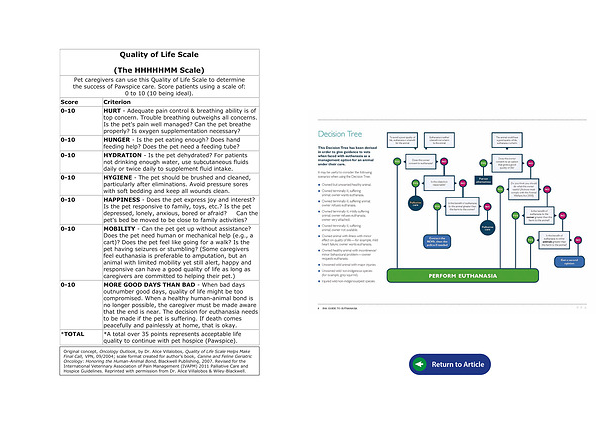 Original concept, Oncology Outlook, by Dr. Alice Villalobos, Quality of Life Scale Helps Make Final Call, VPN, 09 / 2004; scale format created for author’ s book, Canine and Feline Geriatric Oncology: Honoring the Human-Animal Bond, Blackwell Publishing, 2007. Revised for the International Veterinary Association of Pain Management( IVAPM) 2011 Palliative Care and Hospice Guidelines. Reprinted with permission from Dr. Alice Villalobos & Wiley-Blackwell.