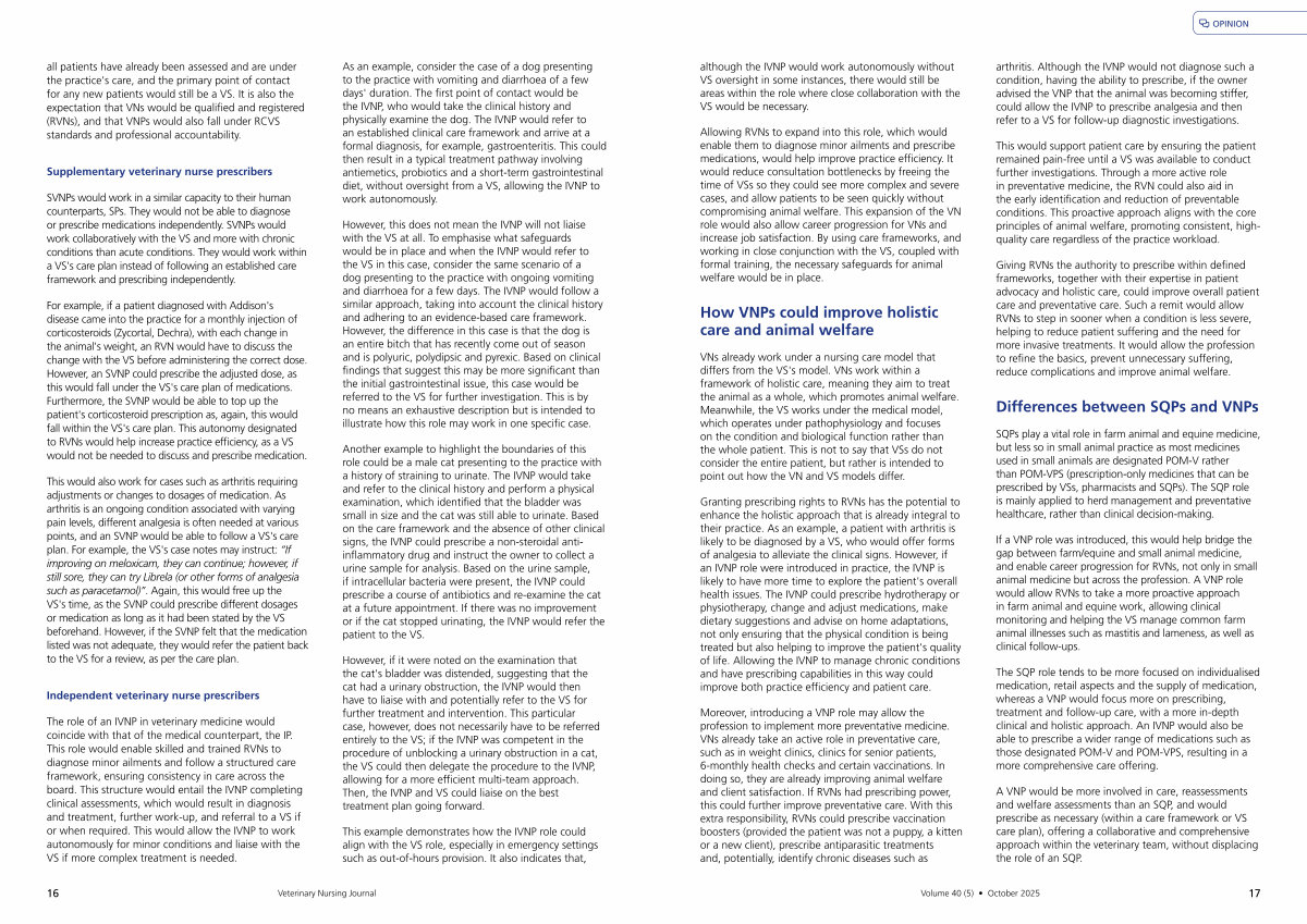 Another example to highlight the boundaries of this role could be a male cat presenting to the practice with a history of straining to urinate. The IVNP would take and refer to the clinical history and perform a physical examination, which identified that the bladder was small in size and the cat was still able to urinate. Based on the care framework and the absence of other clinical signs, the IVNP could prescribe a non-steroidal antiinflammatory drug and instruct the owner to collect a urine sample for analysis. Based on the urine sample, if intracellular bacteria were present, the IVNP could prescribe a course of antibiotics and re-examine the cat at a future appointment. If there was no improvement or if the cat stopped urinating, the IVNP would refer the patient to the VS.