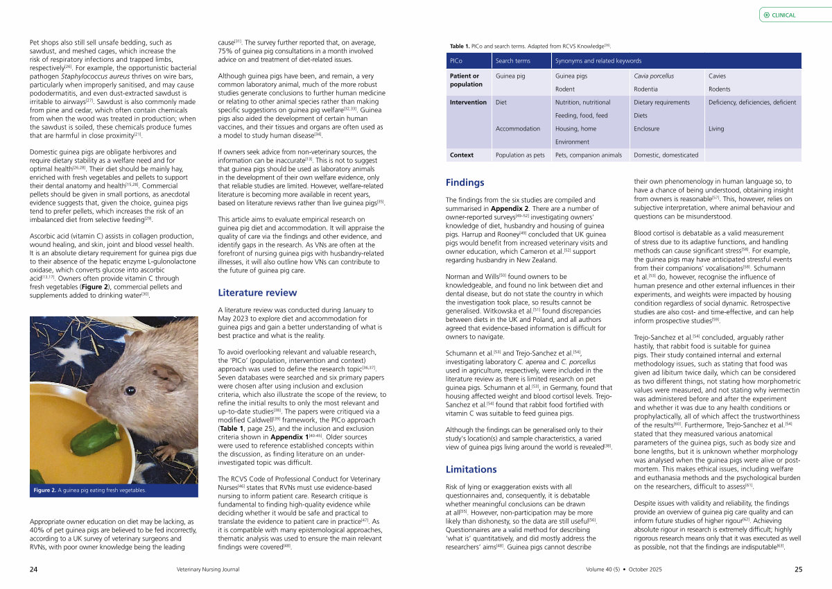 Schumann et al. [ 53 ] and Trejo-Sanchez et al. [ 54 ], investigating laboratory C. aperea and C. porcellus used in agriculture, respectively, were included in the literature review as there is limited research on pet guinea pigs. Schumann et al. [ 53 ], in Germany, found that housing affected weight and blood cortisol levels. Trejo- Sanchez et al. [ 54 ] found that rabbit food fortified with vitamin C was suitable to feed guinea pigs.