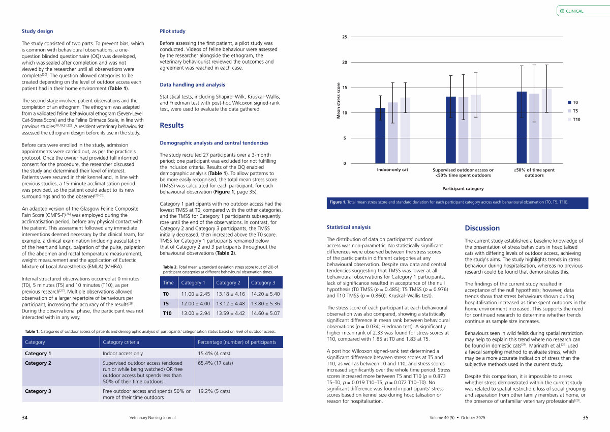 The second stage involved patient observations and the completion of an ethogram. The ethogram was adapted from a validated feline behavioural ethogram( Seven-Level Cat-Stress Score) and the Feline Grimace Scale, in line with previous studies [ 18, 19, 21, 22 ]. A resident veterinary behaviourist assessed the ethogram design before its use in the study.