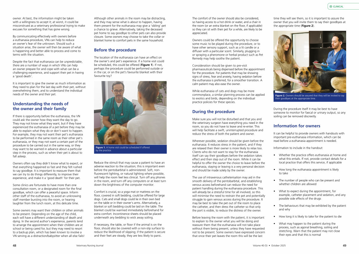 The comfort of the owner should also be considered, so having access to a hot drink or water, and a chair in the room( or an extra blanket on the floor, if applicable) so they can sit with their pet for a while, are likely to be appreciated. time they will see them, so it is important to assure the owner that you will invite them to say their goodbyes at the appropriate time( Figure 2).