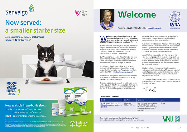 Senvelgo ® contains velagliflozin( sodium-glucose co-transporter 2 [ SGLT-2 ] inhibitor). UK( NI): POM-V IE: POM. Prescription decisions are for the person issuing the prescription alone. Further information available in the SPC or from Boehringer Ingelheim Animal Health UK Ltd., RG12 8YS, UK. UK( NI) Tel: 01344 746959( sales) or 01344 746957( technical), IE Tel: 01 291 3985( all queries). Email: vetenquiries @ boehringer-ingelheim. com. Senvelgo ® is a registered trademark of Boehringer Ingelheim Vetmedica GmbH, used under licence. © 2025 Boehringer Ingelheim Animal Health UK Ltd. All rights reserved. Date of preparation: Aug 2025. UI-PET-0231-2025. Use Medicines Responsibly