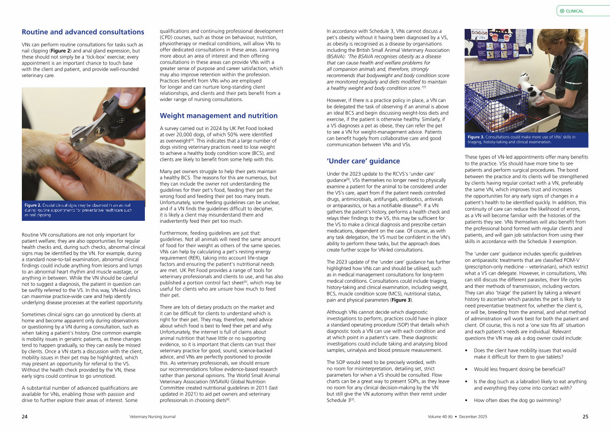Routine VN consultations are not only important for patient welfare; they are also opportunities for regular health checks and, during such checks, abnormal clinical signs may be identified by the VN. For example, during a standard nose-to-tail examination, abnormal clinical findings could include anything from lesions and lumps to an abnormal heart rhythm and muscle wastage, or anything in between. While the VN should be careful not to suggest a diagnosis, the patient in question can be swiftly referred to the VS. In this way, VN-led clinics can maximise practice-wide care and help identify underlying disease processes at the earliest opportunity.