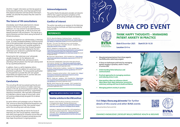 The consulting VN role has evolved significantly and now represents a cornerstone of modern veterinary practice in the UK, by enhancing patient welfare, client satisfaction and operational efficiency. Supported by regulatory frameworks, VNs have been empowered to undertake a diverse range of clinical tasks, while still working collaboratively alongside VSs to deliver optimal care.