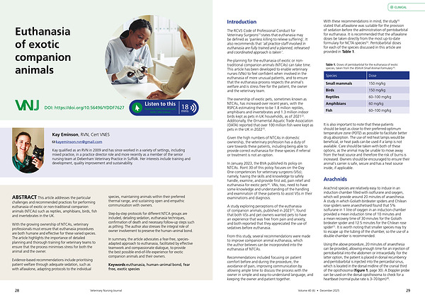 Given the high numbers of NTCAs in domestic ownership, the veterinary profession has a duty of care towards these patients, including being able to provide correct euthanasia for these species if referral or treatment is not an option.