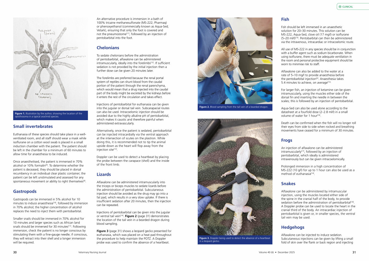 Figure 3( page 31) shows a leopard gecko presented for euthanasia, which was placed on a heat pad throughout the procedure to help maintain the POTZ. A Doppler probe was used to confirm the absence of a heartbeat.