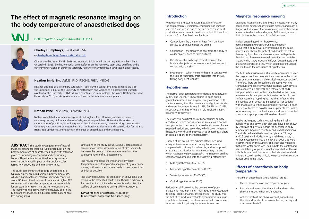 In dogs anaesthetised for thoracolumbar hemilaminectomy surgery, Bruniges and Rioja [ 5 ] found that if an MRI was performed during the same general anaesthesia, the patient had double the risk of developing hypothermia when compared with patients that did not. There were several limitations and variable factors in this study, including different anaesthetists and anaesthetic protocols used, which could have influenced the results and the occurrence of hypothermia.