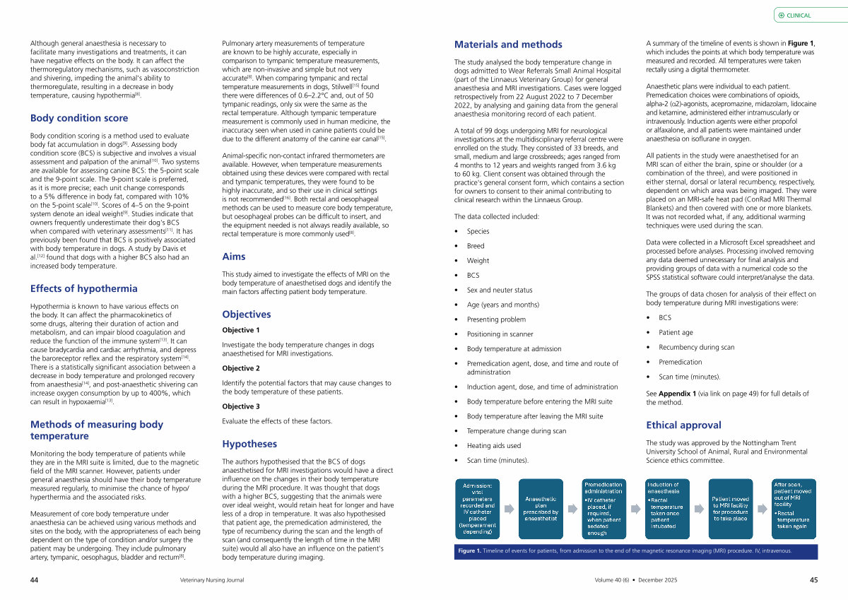 The study analysed the body temperature change in dogs admitted to Wear Referrals Small Animal Hospital( part of the Linnaeus Veterinary Group) for general anaesthesia and MRI investigations. Cases were logged retrospectively from 22 August 2022 to 7 December 2022, by analysing and gaining data from the general anaesthesia monitoring record of each patient.