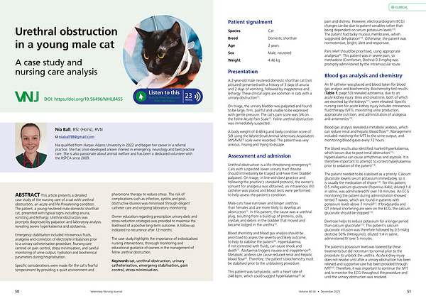 A 2-year-old male neutered domestic shorthair cat( not pictured) presented with a history of 3 days of anuria and 2 days of vomiting, followed by inappetence and lethargy. These clinical signs are common in cats with a urinary obstruction [ 1 ].