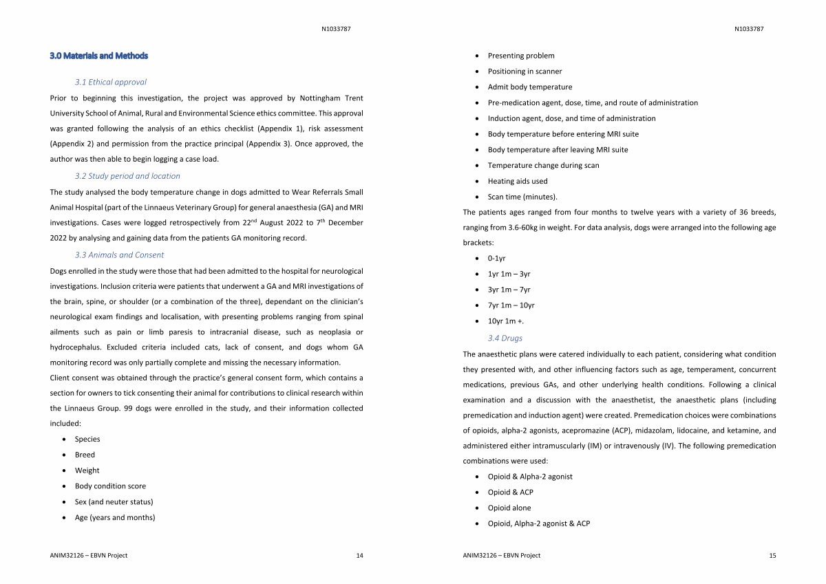 3.3 Animals and Consent Dogs enrolled in the study were those that had been admitted to the hospital for neurological investigations. Inclusion criteria were patients that underwent a GA and MRI investigations of the brain, spine, or shoulder( or a combination of the three), dependant on the clinician’ s neurological exam findings and localisation, with presenting problems ranging from spinal ailments such as pain or limb paresis to intracranial disease, such as neoplasia or hydrocephalus. Excluded criteria included cats, lack of consent, and dogs whom GA monitoring record was only partially complete and missing the necessary information. Client consent was obtained through the practice’ s general consent form, which contains a section for owners to tick consenting their animal for contributions to clinical research within the Linnaeus Group. 99 dogs were enrolled in the study, and their information collected included: