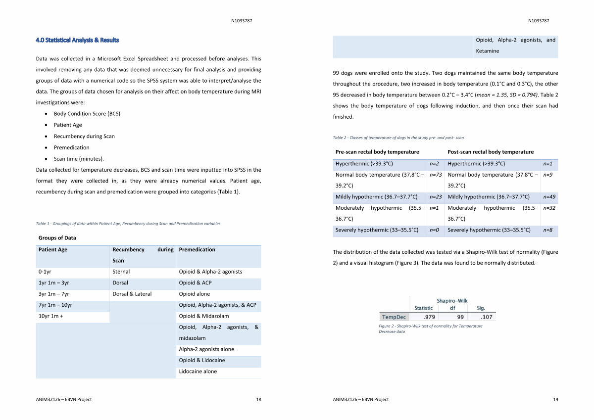 99 dogs were enrolled onto the study. Two dogs maintained the same body temperature throughout the procedure, two increased in body temperature( 0.1 ° C and 0.3 ° C), the other 95 decreased in body temperature between 0.2 ° C – 3.4 ° C( mean = 1.35, SD = 0.794). Table 2 shows the body temperature of dogs following induction, and then once their scan had finished.