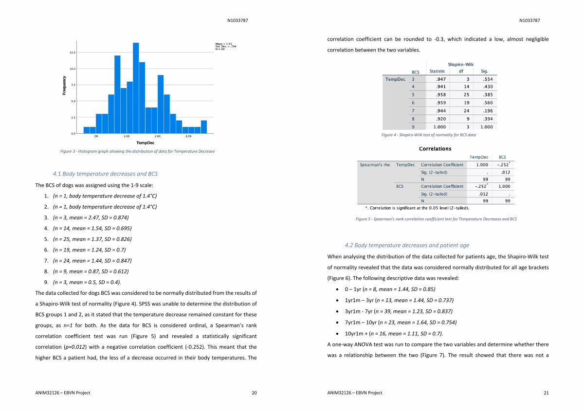 The BCS of dogs was assigned using the 1-9 scale: 1.( n = 1, body temperature decrease of 1.4 ° C) 2.( n = 1, body temperature decrease of 1.4 ° C) 3.( n = 3, mean = 2.47, SD = 0.874) 4.( n = 14, mean = 1.54, SD = 0.695) 5.( n = 25, mean = 1.37, SD = 0.826) 6.( n = 19, mean = 1.24, SD = 0.7) 7.( n = 24, mean = 1.44, SD = 0.847) 8.( n = 9, mean = 0.87, SD = 0.612) 9.( n = 3, mean = 0.5, SD = 0.4). The data collected for dogs BCS was considered to be normally distributed from the results of a Shapiro-Wilk test of normality( Figure 4). SPSS was unable to determine the distribution of BCS groups 1 and 2, as it stated that the temperature decrease remained constant for these groups, as n = 1 for both. As the data for BCS is considered ordinal, a Spearman’ s rank correlation coefficient test was run( Figure 5) and revealed a statistically significant correlation( p = 0.012) with a negative correlation coefficient(-0.252). This meant that the higher BCS a patient had, the less of a decrease occurred in their body temperatures. The
