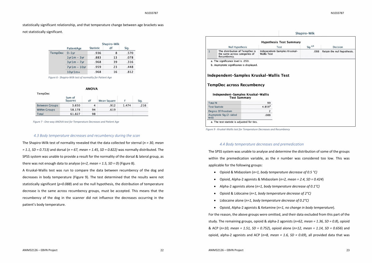 Body temperature decreases and recumbency during the scan The Shapiro-Wilk test of normality revealed that the data collected for sternal( n = 30, mean = 1.1, SD = 0.713) and dorsal( n = 67, mean = 1.45, SD = 0.822) was normally distributed. The SPSS system was unable to provide a result for the normality of the dorsal & lateral group, as there was not enough data to analyse( n = 2, mean = 1.5, SD = 0)( Figure 8). A Kruskal-Wallis test was run to compare the data between recumbency of the dog and decreases in body temperature( Figure 9). The test determined that the results were not statistically significant( p = 0.088) and so the null hypothesis, the distribution of temperature decrease is the same across recumbency groups, must be accepted. This means that the recumbency of the dog in the scanner did not influence the decreases occurring in the patient’ s body temperature.