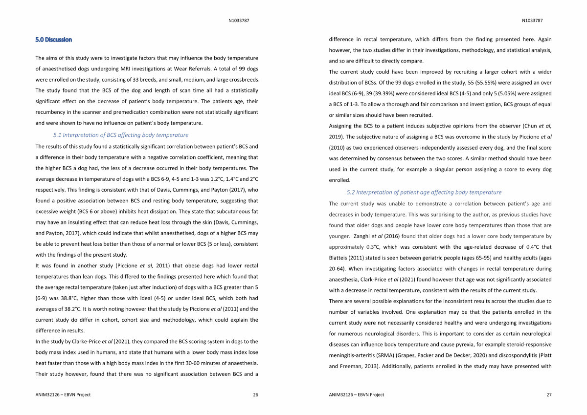 5.1 Interpretation of BCS affecting body temperature The results of this study found a statistically significant correlation between patient’ s BCS and a difference in their body temperature with a negative correlation coefficient, meaning that the higher BCS a dog had, the less of a decrease occurred in their body temperatures. The average decrease in temperature of dogs with a BCS 6-9, 4-5 and 1-3 was 1.2 ° C, 1.4 ° C and 2 ° C respectively. This finding is consistent with that of Davis, Cummings, and Payton( 2017), who found a positive association between BCS and resting body temperature, suggesting that excessive weight( BCS 6 or above) inhibits heat dissipation. They state that subcutaneous fat may have an insulating effect that can reduce heat loss through the skin( Davis, Cummings, and Payton, 2017), which could indicate that whilst anaesthetised, dogs of a higher BCS may be able to prevent heat loss better than those of a normal or lower BCS( 5 or less), consistent with the findings of the present study. It was found in another study( Piccione et al, 2011) that obese dogs had lower rectal temperatures than lean dogs. This differed to the findings presented here which found that the average rectal temperature( taken just after induction) of dogs with a BCS greater than 5( 6-9) was 38.8 ° C, higher than those with ideal( 4-5) or under ideal BCS, which both had averages of 38.2 ° C. It is worth noting however that the study by Piccione et al( 2011) and the current study do differ in cohort, cohort size and methodology, which could explain the difference in results. In the study by Clarke-Price et al( 2021), they compared the BCS scoring system in dogs to the body mass index used in humans, and state that humans with a lower body mass index lose heat faster than those with a high body mass index in the first 30-60 minutes of anaesthesia. Their study however, found that there was no significant association between BCS and a