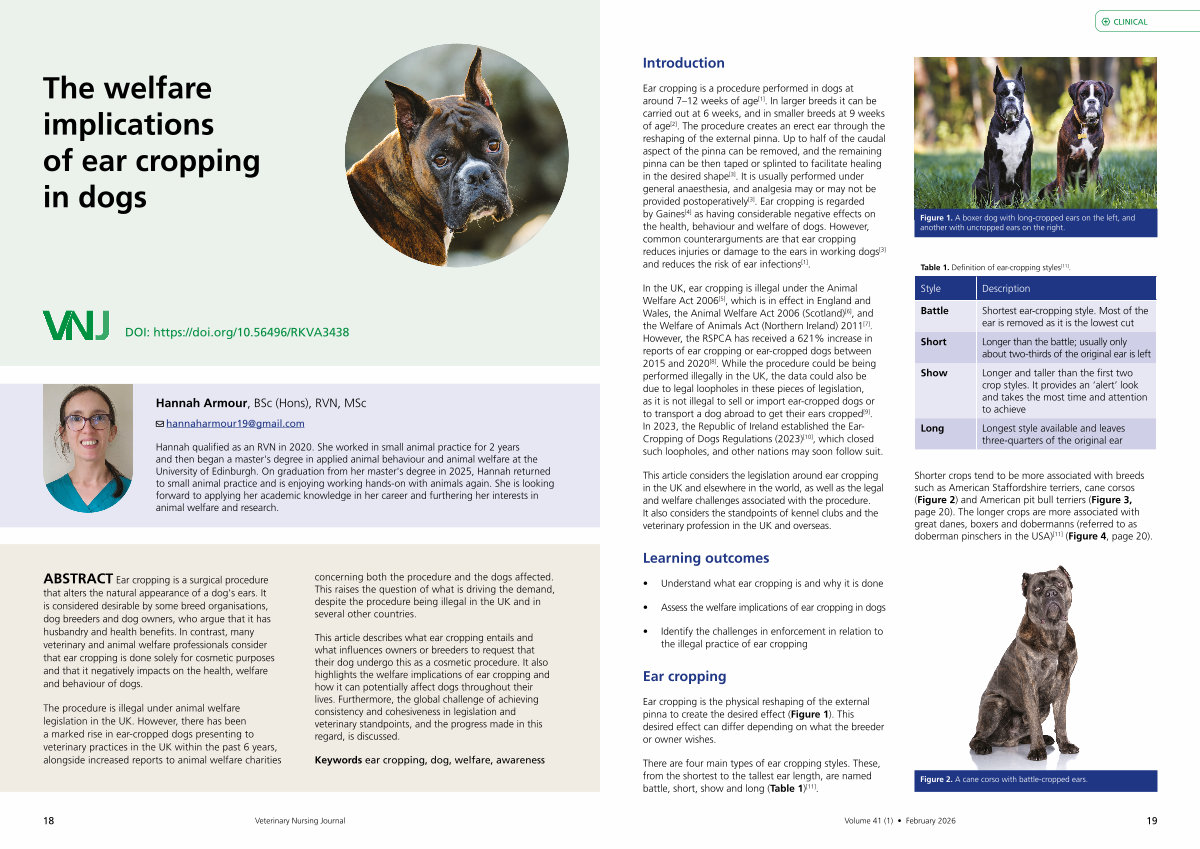 This article describes what ear cropping entails and what influences owners or breeders to request that their dog undergo this as a cosmetic procedure. It also highlights the welfare implications of ear cropping and how it can potentially affect dogs throughout their lives. Furthermore, the global challenge of achieving consistency and cohesiveness in legislation and veterinary standpoints, and the progress made in this regard, is discussed.