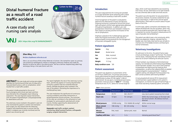 The report highlights the role of the veterinary nursing team, and the key aspects of nursing required when caring for a patient that has sustained vehicular trauma. Multiple disciplines were involved in the care of the patient, illustrating the importance of a multidisciplinary team.