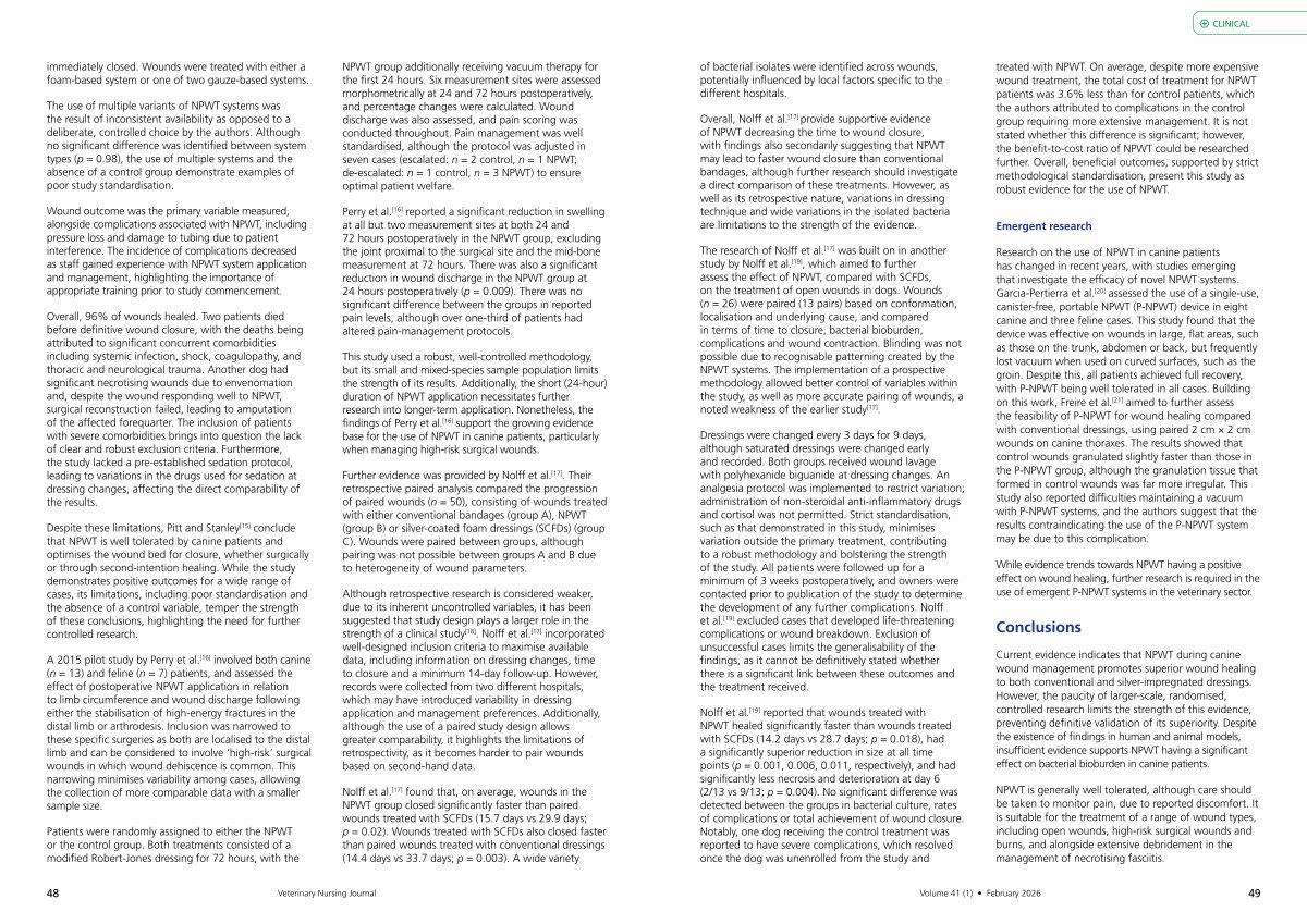 Despite these limitations, Pitt and Stanley [ 15 ] conclude that NPWT is well tolerated by canine patients and optimises the wound bed for closure, whether surgically or through second-intention healing. While the study demonstrates positive outcomes for a wide range of cases, its limitations, including poor standardisation and the absence of a control variable, temper the strength of these conclusions, highlighting the need for further controlled research.