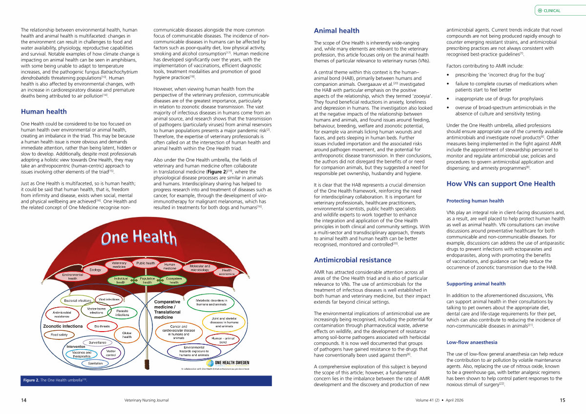 The scope of One Health is inherently wide-ranging and, while many elements are relevant to the veterinary profession, this article focuses only on the animal health themes of particular relevance to veterinary nurses( VNs).