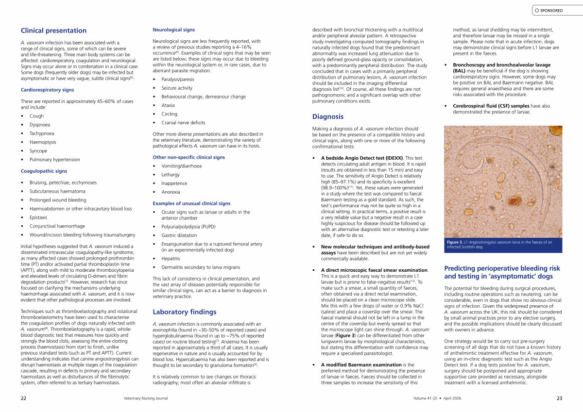 Techniques such as thromboelastography and rotational thromboelastometry have been used to characterise the coagulation profiles of dogs naturally infected with A. vasorum [ 8 ]. Thromboelastography is a rapid, wholeblood diagnostic test that measures how quickly and strongly the blood clots, assessing the entire clotting process( haemostasis) from start to finish, unlike previous standard tests( such as PT and APTT). Current understanding indicates that canine angiostrongylosis can disrupt haemostasis at multiple stages of the coagulation cascade, resulting in defects in primary and secondary haemostasis as well as disturbances of the fibrinolytic system, often referred to as tertiary haemostasis.
