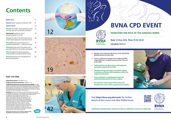 © 2026 British Veterinary Nursing Association( BVNA). All rights reserved. Copyright of some cited articles and extracts within VNJ may remain with the author( s). For the avoidance of doubt, no reproduction of this digital or print publication, or the articles and extracts within, is permitted without prior written authorisation from the editor on behalf of BVNA and, where applicable, cited author( s).