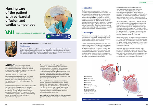 The insufficient filling and emptying of the heart leads to increased pressure of the vessels in and around the lungs, making it more difficult for the animal to take deep breaths, posing the risk of respiratory arrest and, ultimately, cardiopulmonary arrest [ 5 ]. A cough may be present, caused by the surplus fluid accumulated around the heart and lungs [ 6 ]. This may be apparent during a hands-off examination, alongside laboured or shallow breathing and / or increased respiratory rate.