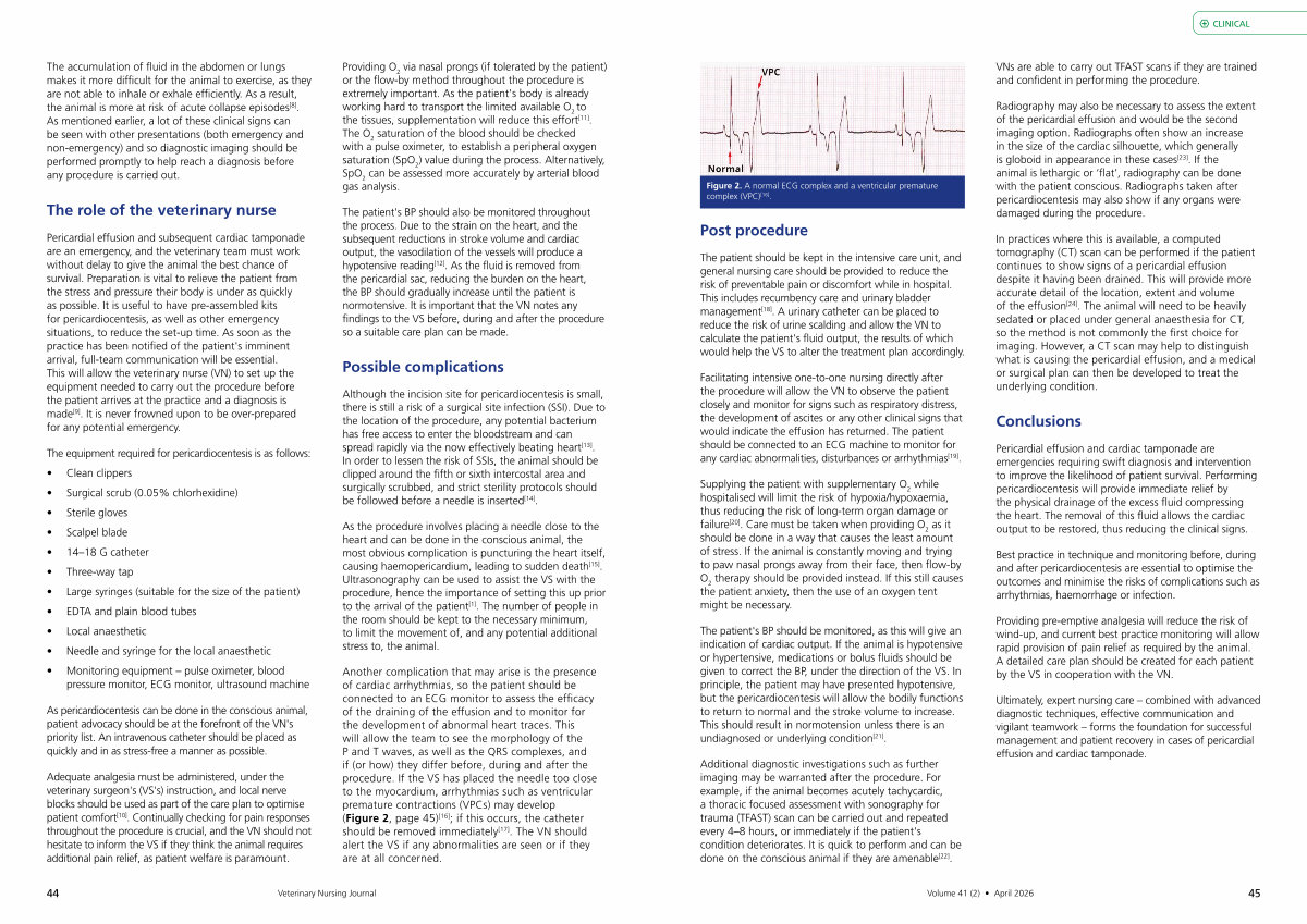 Best practice in technique and monitoring before, during and after pericardiocentesis are essential to optimise the outcomes and minimise the risks of complications such as arrhythmias, haemorrhage or infection.
