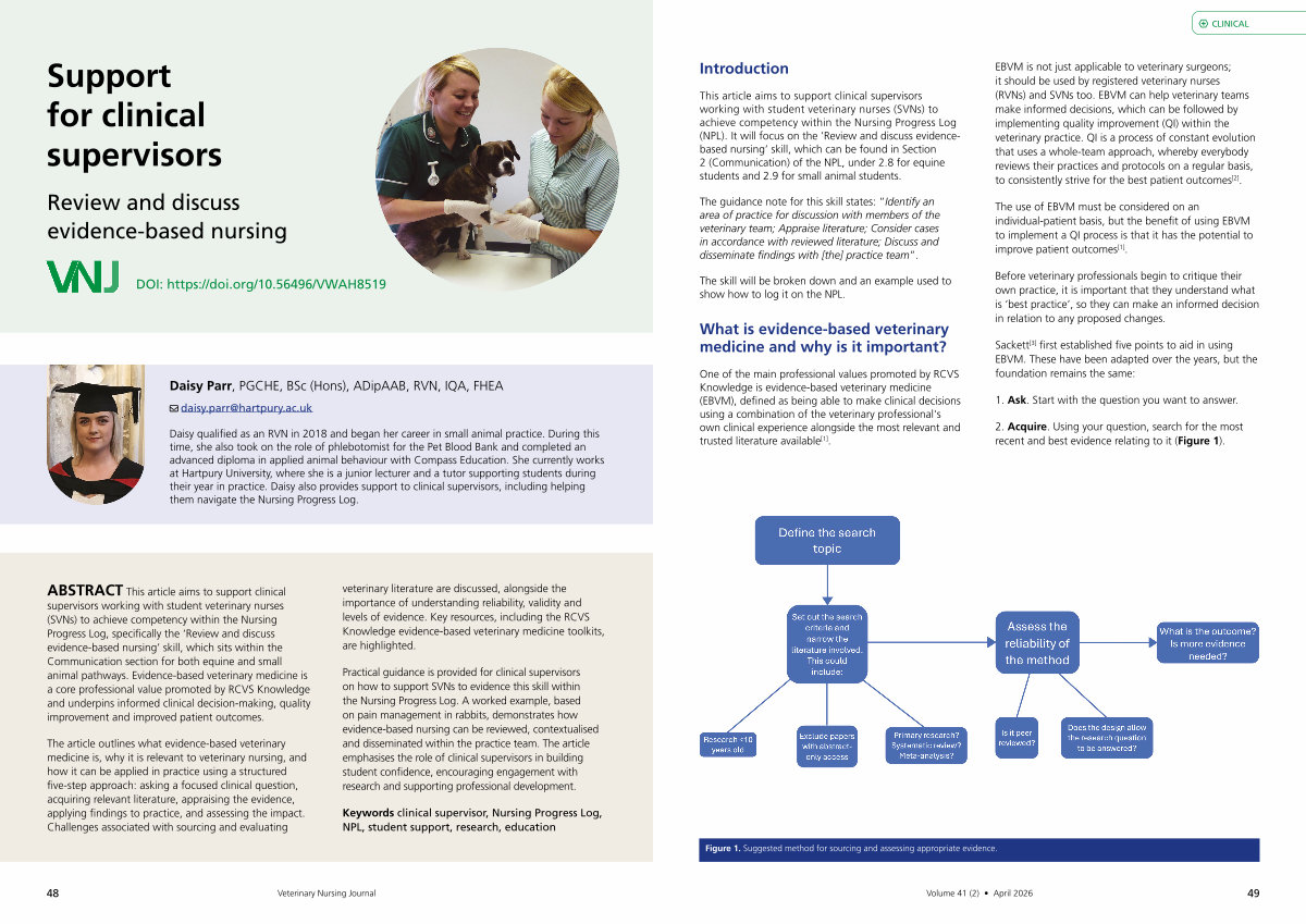 The article outlines what evidence-based veterinary medicine is, why it is relevant to veterinary nursing, and how it can be applied in practice using a structured five-step approach: asking a focused clinical question, acquiring relevant literature, appraising the evidence, applying findings to practice, and assessing the impact. Challenges associated with sourcing and evaluating veterinary literature are discussed, alongside the importance of understanding reliability, validity and levels of evidence. Key resources, including the RCVS Knowledge evidence-based veterinary medicine toolkits, are highlighted.