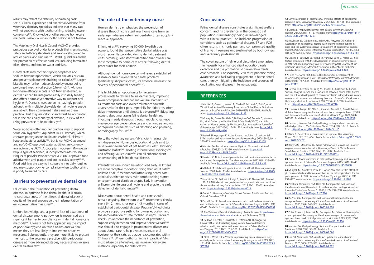The covert nature of feline oral discomfort emphasises the necessity for enhanced client education, early detection and the promotion of preventative dental care protocols. Consequently, VNs must prioritise raising awareness and facilitating engagement in home dental care, thereby mitigating the incidence and sequelae of debilitating oral diseases in feline patients.