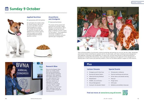 There will also be plenty of social events , practical workshops and seminars you can join over the 3 days . Workshops and seminars feature something for everyone and for all career levels , with topics including wound management , SVN wellbeing , calculations and rehabilitation , to name a few . We also have seminars on pay and professional development , creating feline blood drives , and a case-based comparison of the approach to the management of feeding tubes in both human and veterinary medicine . Check out the BVNA website to register for these sessions .