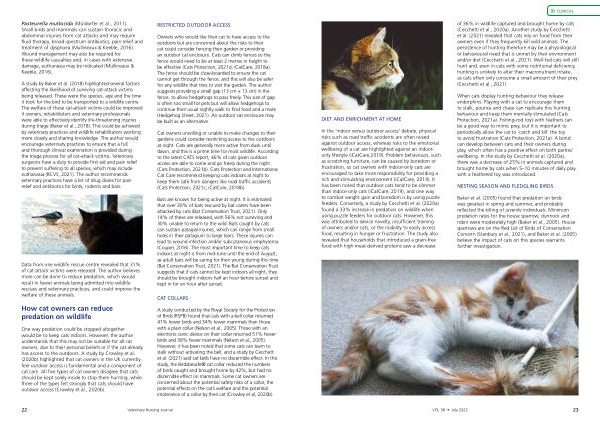 In the ‘ indoor versus outdoor access ’ debate , physical risks such as road traffic accidents are often raised against outdoor access , whereas risks to the emotional wellbeing of a cat are highlighted against an indooronly lifestyle ( iCatCare , 2019 ). Problem behaviours , such as scratching furniture , can be caused by boredom or frustration , so cat owners with indoor-only cats are encouraged to take more responsibility for providing a rich and stimulating environment ( iCatCare , 2019 ). It has been noted that outdoor cats tend to be slimmer than indoor-only cats ( iCatCare , 2019 ), and one way to combat weight gain and boredom is by using puzzle feeders . Conversely , a study by Cecchetti et al . ( 2020a ) found a 33 % increase in predation on wildlife when using puzzle feeders for outdoor cats . However , this was attributed to device novelty , insufficient training of owners and / or cats , or the inability to easily access food , resulting in hunger or frustration . The study also revealed that households that introduced a grain-free food with high meat-derived proteins saw a decrease