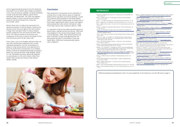 Baxter , C . J . K . ( 2007 ) The dental clinic . Veterinary Nursing Journal . 22 ( 7 ), 17 – 18 . Bloor , C . ( 2006 ) Intra-oral radiography . Veterinary Nursing Journal . 21 ( 4 ), 13 – 16 .