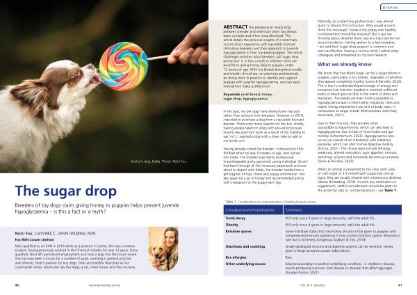 ABSTRACT The professional relationship between breeder and veterinary team has always been complex and often misunderstood . This article details the personal insights of a veterinary nurse ’ s direct experience with reputable licensed chihuahua breeders and their approach to juvenile hypoglycaemia in their toy-breed puppies . The article challenges whether what breeders call ‘ sugar drop prevention ’ is in fact a myth or whether there are benefits to giving honey daily to puppies under 12 weeks of age . With toy breeds being bred smaller and smaller , should we , as veterinary professionals , be doing more in practice to identify and support puppies with juvenile hypoglycaemia , and can early intervention make a difference ?