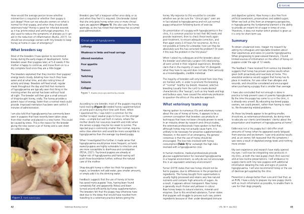 Having spoken to numerous VSs and veterinary nurses about the use of honey at home , it appears to be a common conception that breeders use products or techniques that have not been clinically proven to work . In an industry driven by research and clinical studies , the veterinary professionals I have spoken to feel that , although honey may not actually cause harm , it is unlikely to be necessary for proactive supplementation . However , in the event of an emergency , the general consensus is that the use of honey should be encouraged . The low risks involved with honey consumption ( Table 1 ) far outweigh the high risks involved with a hypoglycaemic crisis .