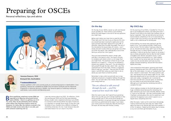 Once you have entered the station , remain calm and take it one step at a time . You have 6 minutes to complete each station which is a lot longer than you might think . The examiner is there for you to ask questions or to speak to – if they are not allowed to answer your question , they won ’ t . You are allowed to talk yourself through the task , which I did – you ’ ll be surprised how much this helps . If there is a layperson there to help you , use them – they are there for that reason . Just tell them what you want them to do or where you want them to hold the animal .